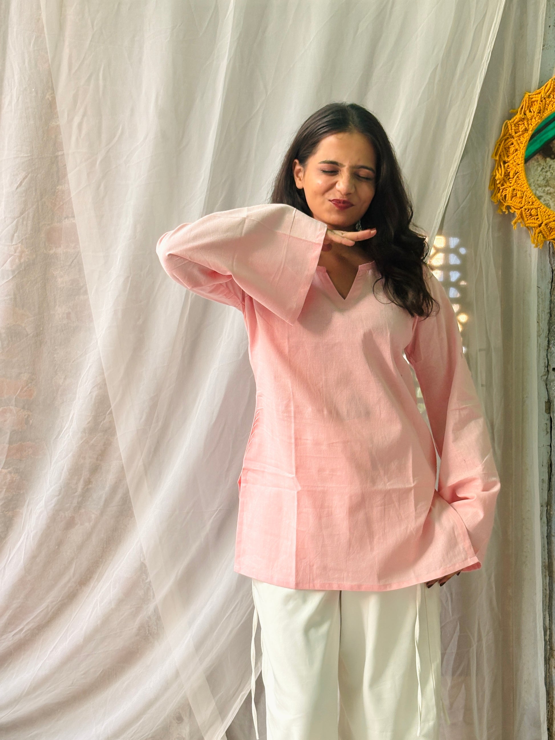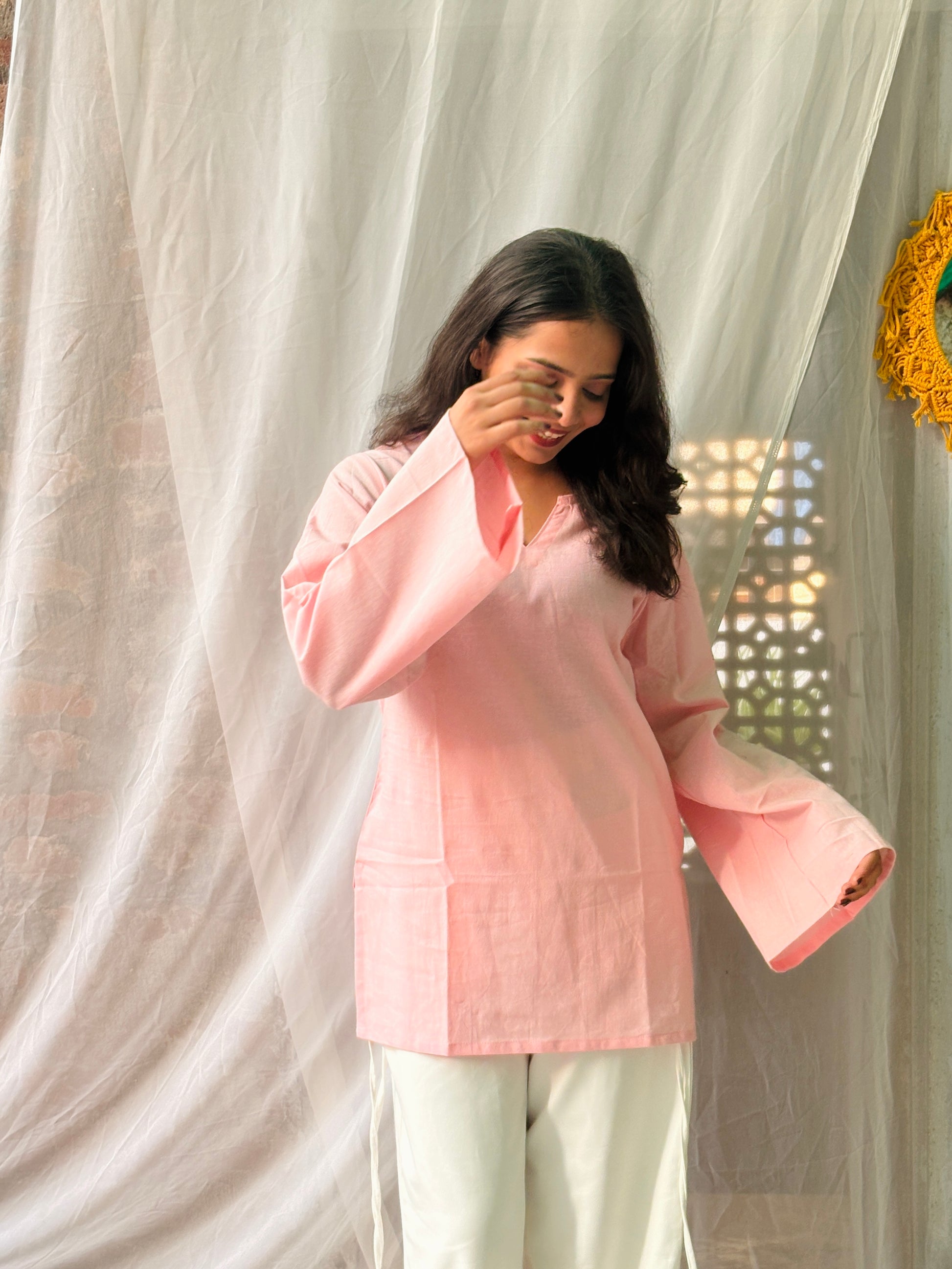 A sweet baby-pink cotton kurti with a soft princess neckline that frames the collarbone beautifully. Light, breezy, and feminine—perfect for days when you want comfort without trying too hard.
