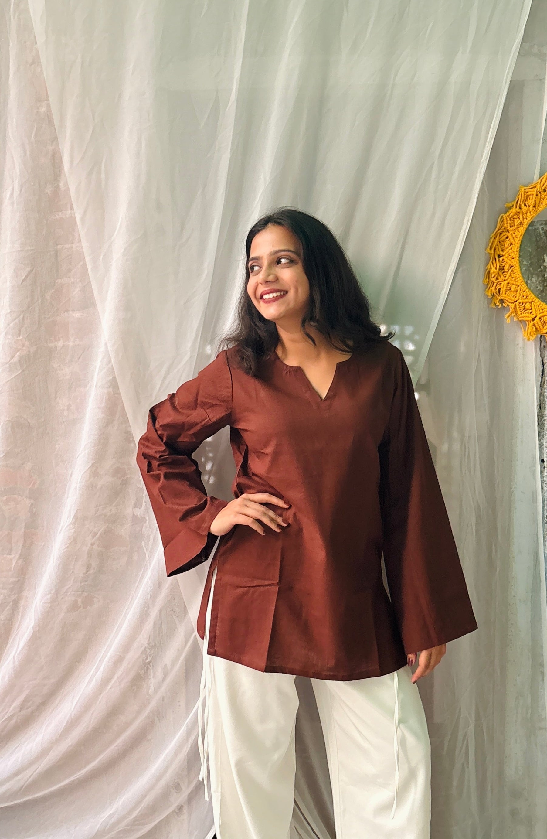 This warm brown cotton kurti features a gently curved princess V neckline that adds a touch of softness to its earthy tone. Ideal for days when you want something simple, grounded, and put-together.