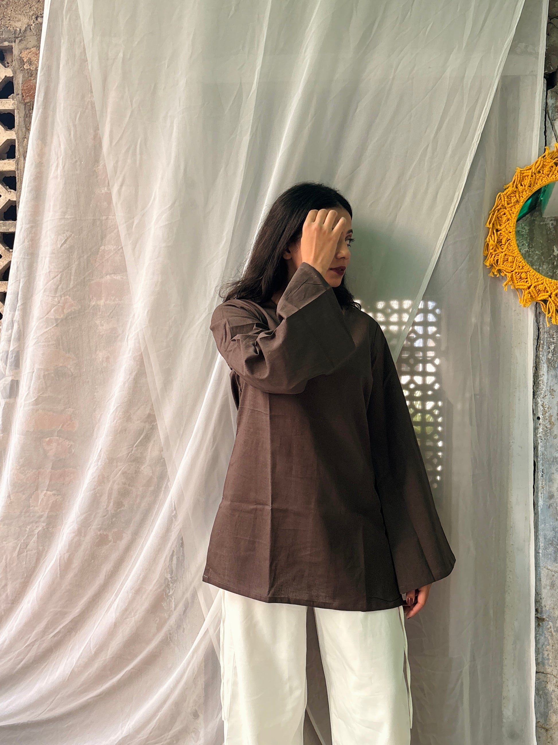 A soft grey cotton kurti crafted with a clean princess neckline, giving it a calm, minimal vibe. It’s the perfect “easy day” outfit—light, breathable, and surprisingly stylish.