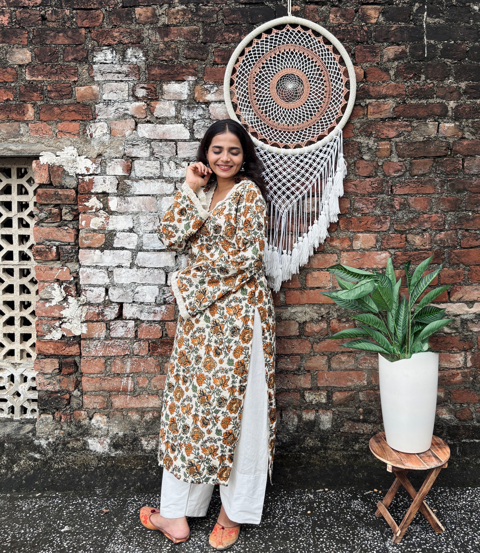 This cream kurti is decorated with mustard and green floral prints, giving it a warm and fresh look. The neckline and sleeves are finished with soft crochet lace, adding a delicate touch. Light, airy, and perfect for casual day wear.